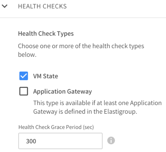 Elastigroup provides configurable health checks to ensure that your VMs are ready and healthy for running your workloads. You can define health checks when you are creating a new Elastigroup or add them to an existing Elastigroup in the Compute configuration.