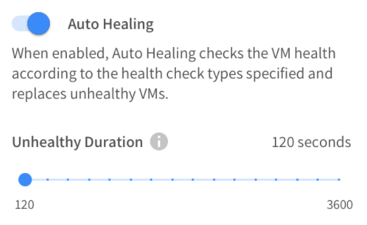 - Set Unhealthy Duration. This is the amount of time (in seconds) to keep existing VMs that are found unhealthy before the VM is terminated and replaced with a new one. An instance must be found healthy at least one for this to work.