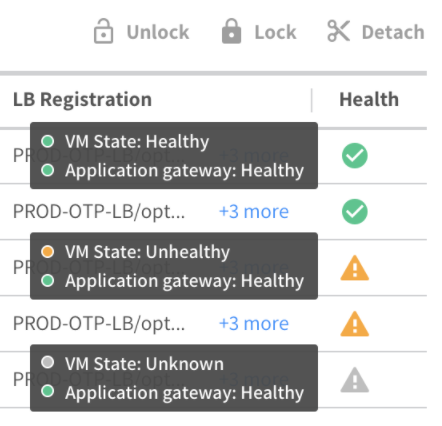 In the Health column, hover the cursor over a specific icon. A detailed summary of the health checks for that VM appears.