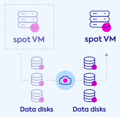 The same disk is detached from the original VM and reattached to the newly launched VM. If the new VM is launched in a different availability zone (AZ), Spot creates a new disk from the latest snapshot and attaches it to the new VM (as disks cannot be migrated between AZs). Spot maintains the same disks as long as the VM is launched in the same AZ.